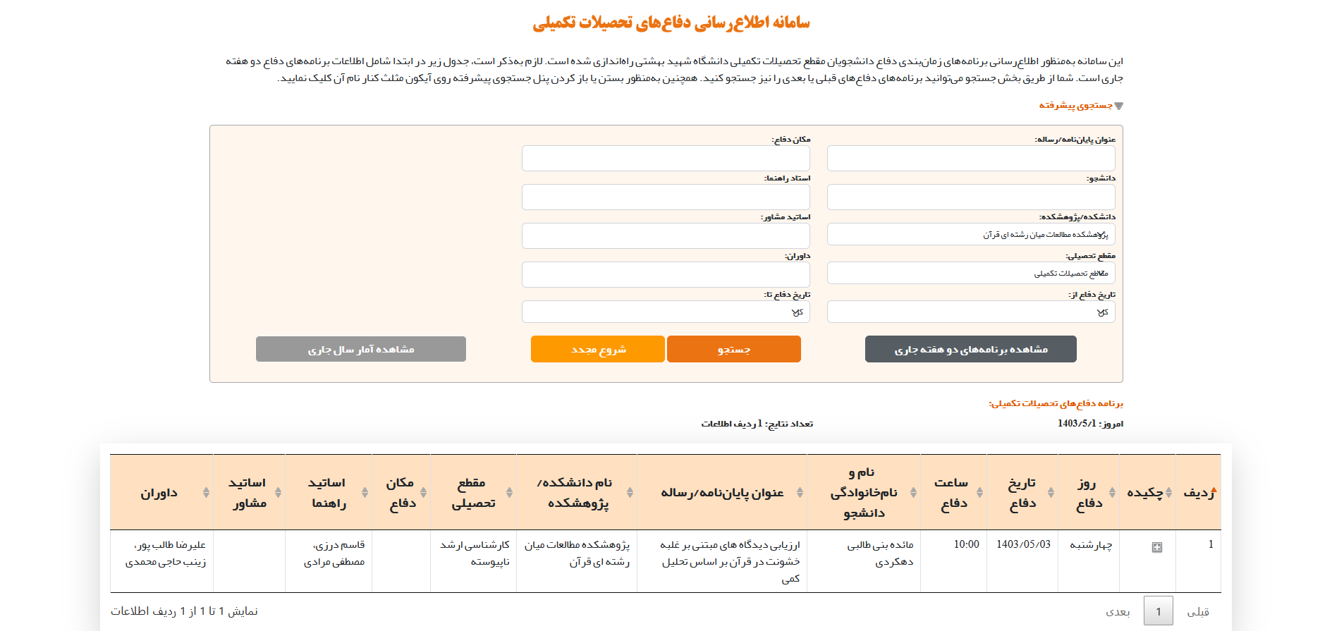 "جهت مشاهده اطلاعات دفاع دانشجویان پژوهشکده، می توانید به سامانه اطلاع رسانی دفاعهای تحصیلات تکمیلی در وب سایت دانشگاه شهید بهشتی به ادرس ذیل مراجعه نمایید."