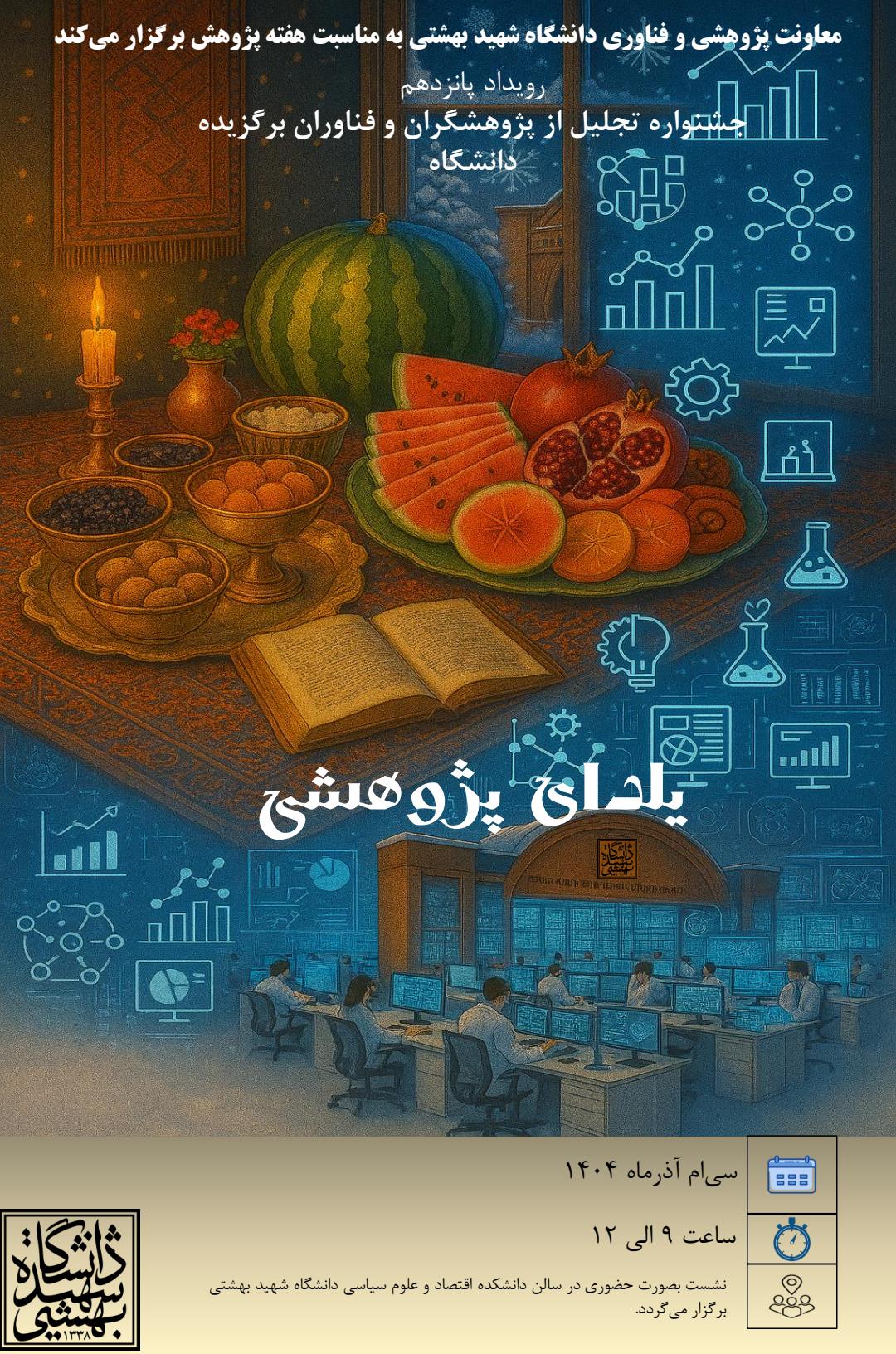 به مناسبت گرامیداشت هفته پژوهش و فناوری، معاونت پژوهشی و فناوری دانشگاه شهید بهشتی رویداد «یلدای پژوهشی» را با هدف تقدیر از برترین پژوهشگران و فناوران دانشگاه برگزار می‌کند.