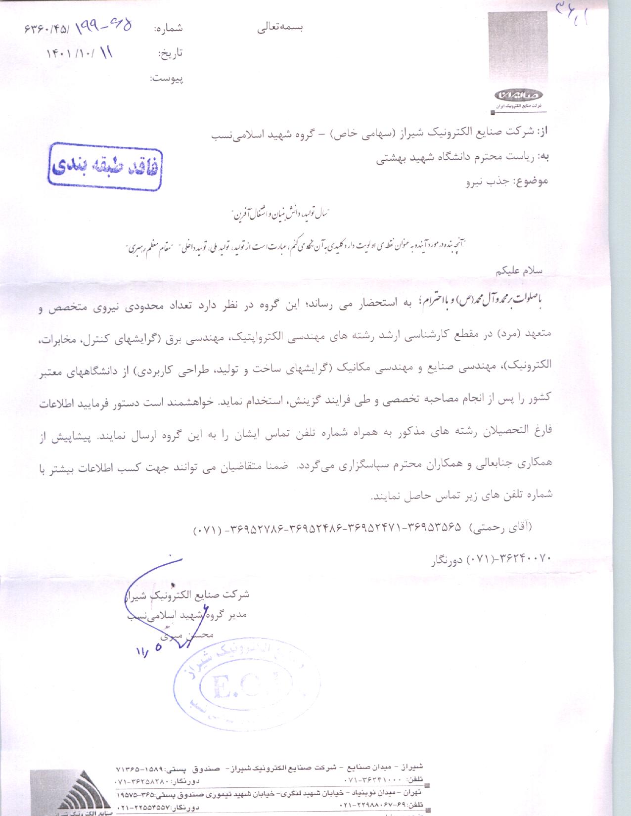 شرکت صاایران در نظر دارد تعدادی نیروی متخصص بر اساس فایل پیوست جذب کنند